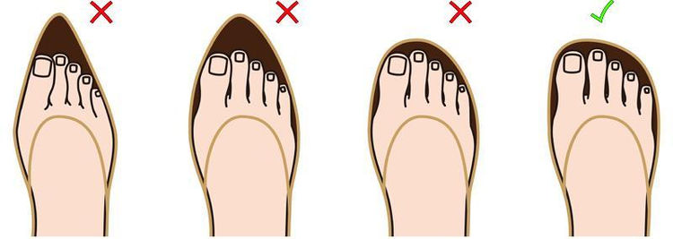 Zu enge Schuhe quetschen die Füße und die Zehen werden gestaucht. Weil die Muskeln, die die Zehen bewegen, ihren Ursprung in den Waden haben, können eingeschränkte Zehen zu Durchblutungsstörungen in den Beinen führen. Sind Schuhe zu groß oder zu weit, stimmen die Proportionen des Schuhs mit den Proportionen des Fußes nicht überein. Sind die Schuhe zu weit, findet der Fuß keinen Halt und rutscht in den zum Abrollen gedachten Leerraum im Schuh, die so genannte Zugabe. Dadurch werden die Zehen bei jedem Schritt genauso gestaucht, als sei der Schuh zu klein. Gleichzeitig ist an der Ferse zu viel Platz, so dass der Fuß aus dem Schuh schlappt. Sind Schuhe zu lang, behindert er den Fuß beim Abrollen. Dies kann den Gang verändern und die Gelenke stärker belasten. Nach längerer Zeit kann der Vorfuß im schlimmsten Fall sogar versteifen.